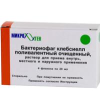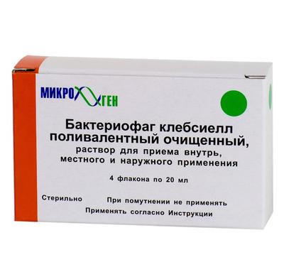 Артикул: 73716Полное название:Бактериофаг клебсиелл пневмонии очищенный р-р д/приема внутрь, местн. и наруж. примен. 20 мл №4 флаконы, Микроген НПО АО (Уфа)